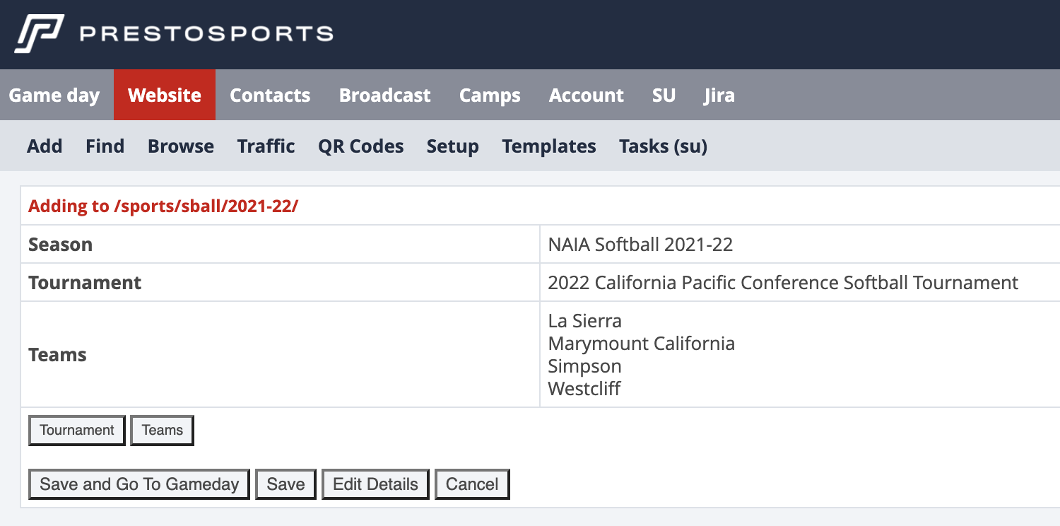 You have to select the sport, season, tournament, tournament and enter the URL path for the teams and players pages for the tournament. Then click Save Tournament.